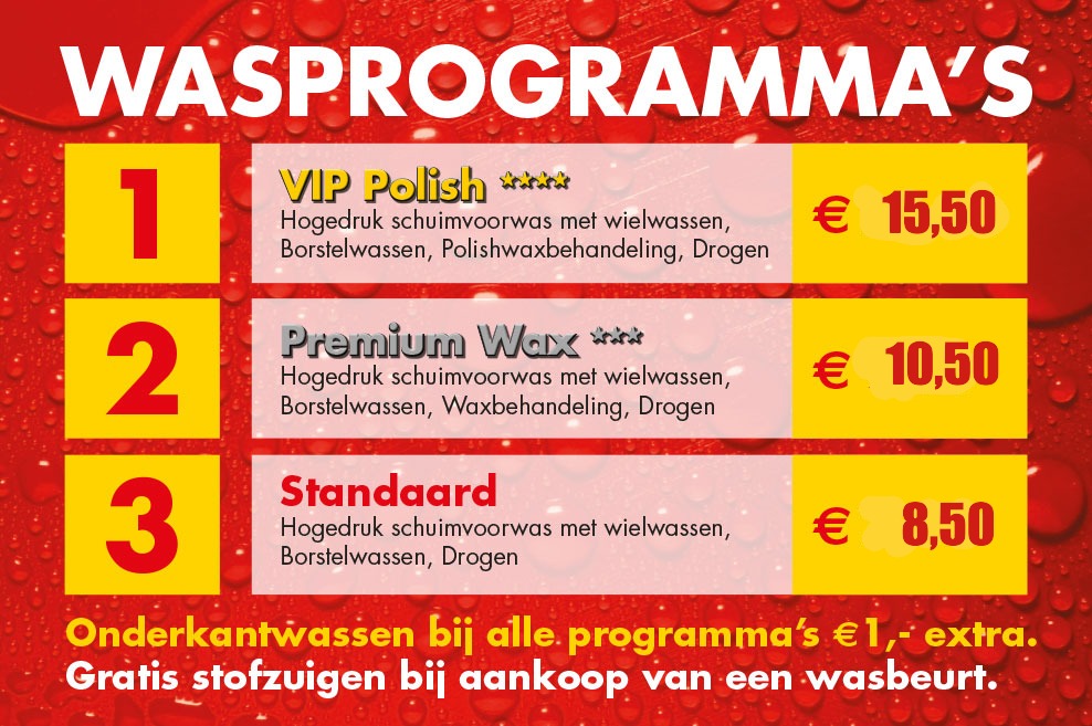 Bij een tankbeurt krijgt u per 20 liter een knipje in uw wasspaarkaart. Na 8 knipjes is uw wasspaarkaart vol en kunt u gratis uw auto wassen met wasprogramma 3 of krijgt u € 7,95 korting als u uw wasbeurt wilt opwaarderen voor een uitgebreider programma.